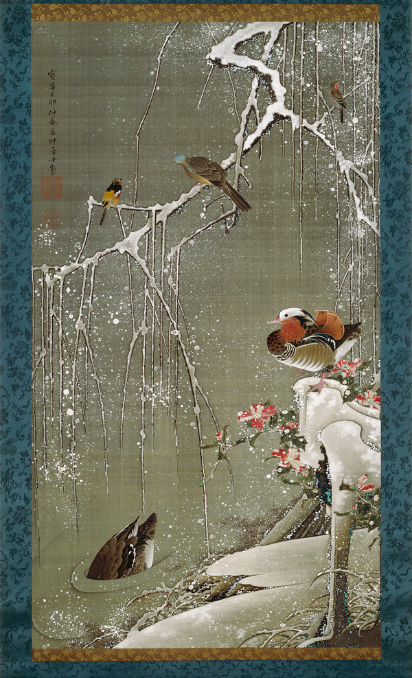 Canards mandarins sous la neige, couleurs sur soie 142 x 79,8 cm. © Sannomaru Shōzōkan (Musée des collections impériales), Bureau de la Maison impériale, Tokyo.